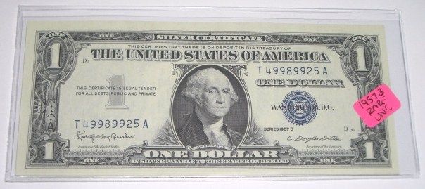 1957 B SERIES $1 SILVER CERTIFICATE SERIAL # T49989925A *EXTREMELY RARE UNC HIGH GRADE*!! ***Coin, Currency & All Items Listed in this auction - Grades, Conditions and Values are not Safe Deposit Coins LLC Responsibilty. Grades, Condition and Values are determined by Consigner(s) & Buyers ONLY