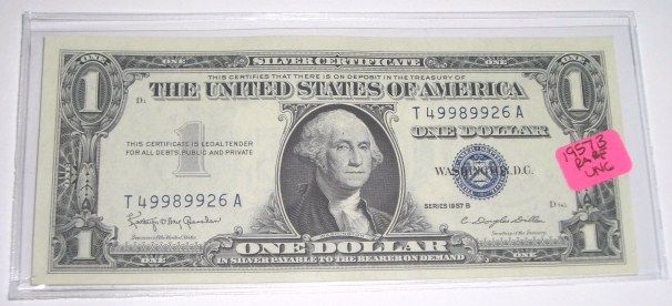 1957 B SERIES $1 SILVER CERTIFICATE SERIAL # T49989926A *EXTREMELY RARE UNC HIGH GRADE*!! ***Coin, Currency & All Items Listed in this auction - Grades, Conditions and Values are not Safe Deposit Coins LLC Responsibilty. Grades, Condition and Values are determined by Consigner(s) & Buyers ONLY