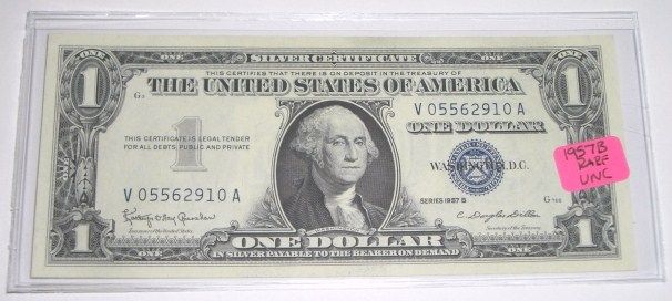 1957 B SERIES $1 SILVER CERTIFICATE SERIAL # V05562910A *EXTREMELY RARE UNC HIGH GRADE*!! ***Coin, Currency & All Items Listed in this auction - Grades, Conditions and Values are not Safe Deposit Coins LLC Responsibilty. Grades, Condition and Values are determined by Consigner(s) & Buyers ONLY