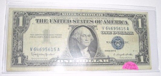 1957 B SERIES $1 SILVER CERTIFICATE SERIAL # V64695615A *RARE EXTRA FINE HIGH GRADE*!! ***Coin, Currency & All Items Listed in this auction - Grades, Conditions and Values are not Safe Deposit Coins LLC Responsibilty. Grades, Condition and Values are determined by Consigner(s) & Buyers ONLY