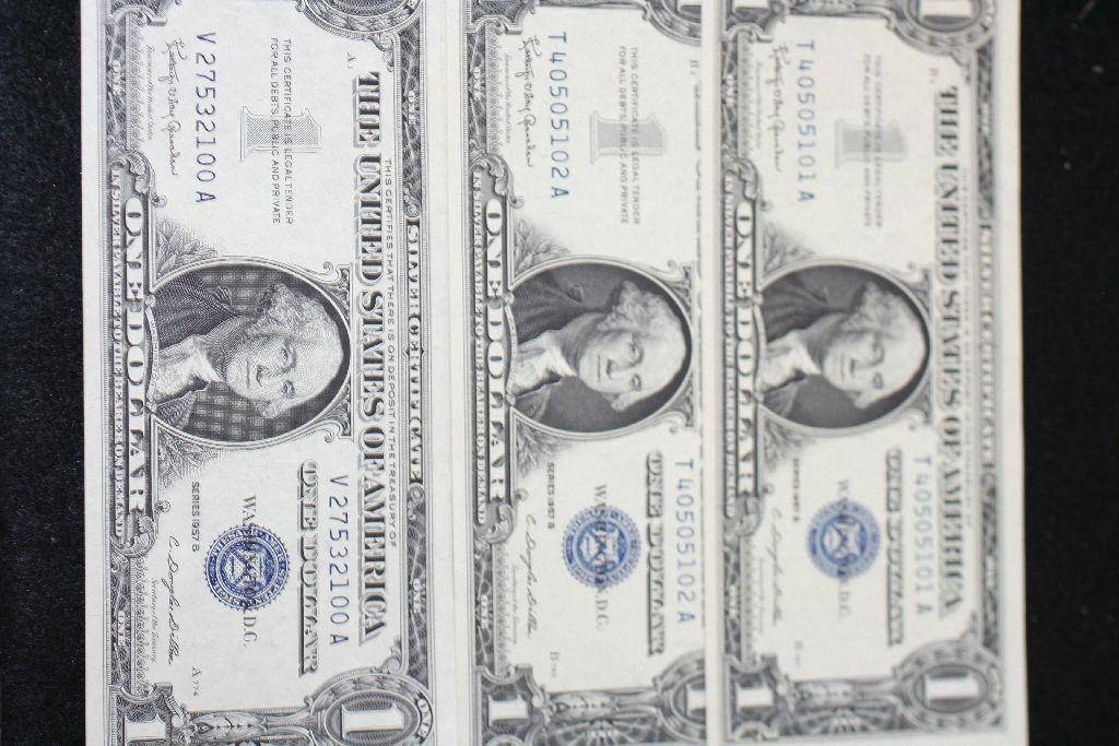 1957-B US Silver Certificate $1, Blue Seal, lot of 3 with 2 Consecutive Numbers