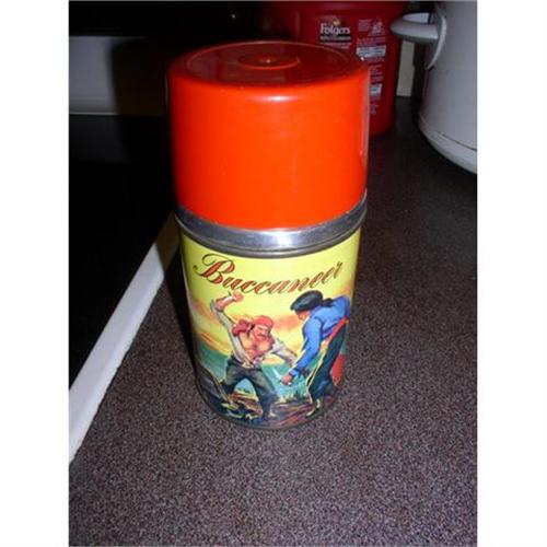 THIS IS A 1957 BUCCANEER LUNCH BOX THERMOS MADE BY THE ALLADIN INDUSTRIES INC. COMPANY. THE GRAPHICS ARE VERY VIVID. THERE IS NO RUST INSIDE THERMOS. THE STOPPER FITS TIGHTLY. THE CUP HAS A CRACK ON IT. OVERALL A VERY GOOD COLLECTABLE FOR YOUR COLLECTION.