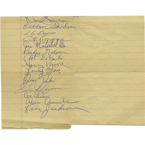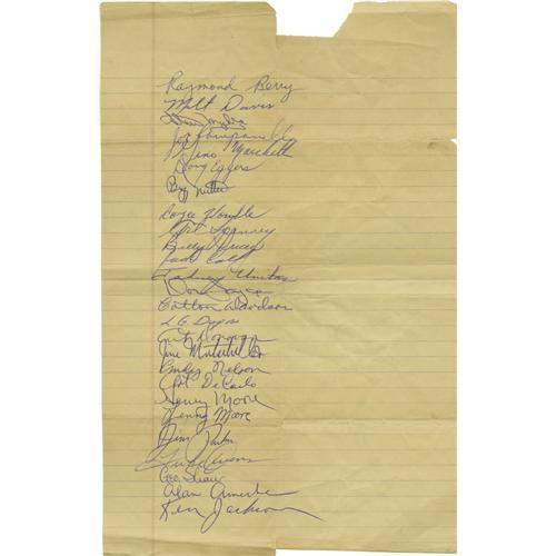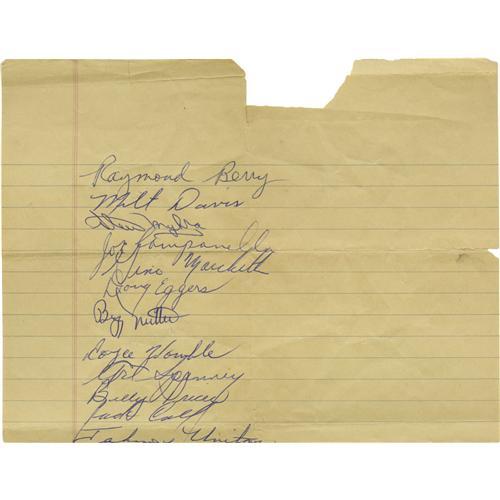 <B>1957 Baltimore Colts Team Signed Sheet.</B></I> Essentially the same team that would conquer the New York Giants to win "The Greatest Game Ever Played" and the 1958 NFL Championship. Twenty-six flawless blue ink signatures are stacked on this lined legal-sized sheet, most notably Berry, Marchetti, Unitas, Donovan, Lenny Moore, Jim Parker and Ameche. A vertical center fold has caused some separation, which has been reinforced on the back with vintage tape. As our catalog imagery should illustrate, this does little to affect the visual appeal of the page. <I>LOA from PSA/DNA.</B></I>