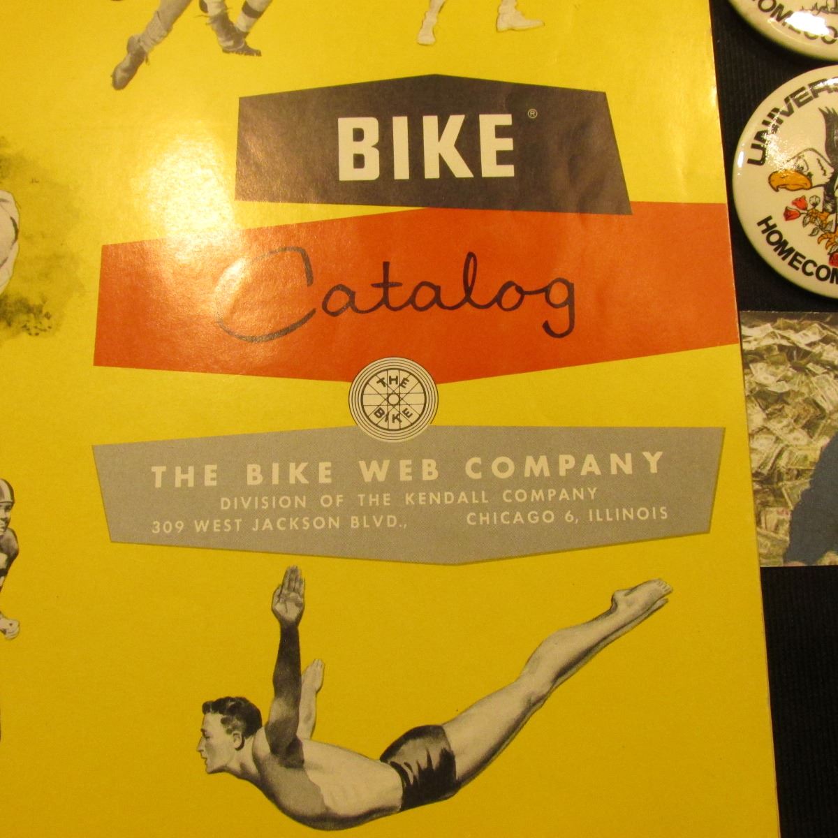 1957 "Bike Catalog The Bike Web Company" & (3) different 1970-80 era Iowa Hawkeyes Pinbacks.