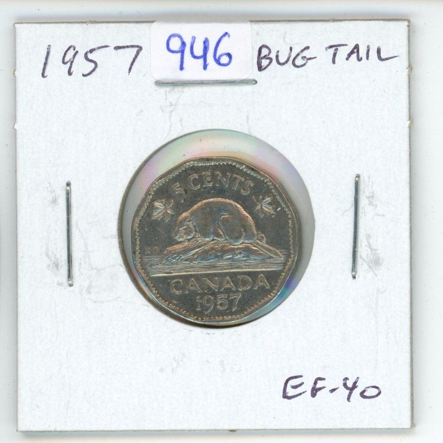 1957 Bug Tail 5 Cents. There is a Die Chip on the end of the beaver’s tail that looks like a bug. EF-40.