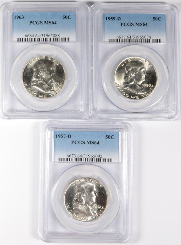 1957-D, 1959-D & 1963 FRANKLIN HALF DOLLARS, PCGS MS-64