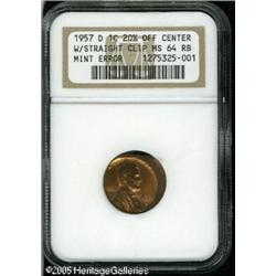<B>1957-D 1C Lincoln Cent--20% Off Center with Straight Clip--MS64 Red and Brown NGC.</B></I> Struck off center toward 8 o'clock, this piece also has a straight clip across the top of the unstruck portion of the coin. The obverse has a couple of small carbon flecks, otherwise a lovely piece with nearly full Red color. Lot:10860