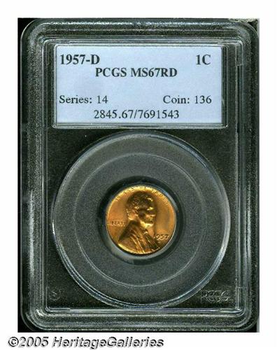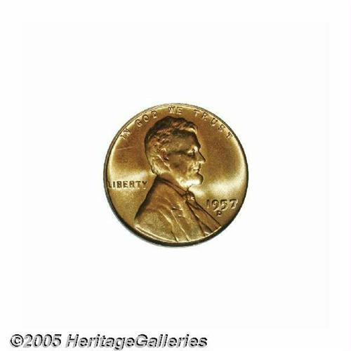 <B>1957-D<1C> MS67 Red PCGS.</B></I> Full mint bloom accents boldly impressed and essentially blemish-free surfaces. Population: 13 in 67 Red, none are finer at PCGS (6/05).<BR><I>From The William Bickel Collection, Part One.</B></I>