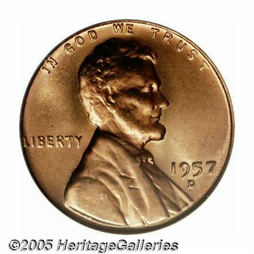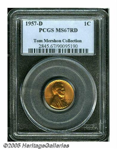 <B>1957-D<1C> MS67 Red PCGS.</B></I> Sharply detailed with rich orange-gold color and luxuriant luster over nearly mark-free surfaces. A Registry bound late-date Wheat Cent. Present population: 13 in 67, none finer (3/05).<BR><I>From The Tom Mershon #2 All-Time PCGS Registry Set of Lincoln Wheat Cents.</B></I>