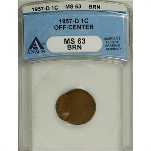 <B>1957-D 1C Lincoln Cent--Off Center--MS63 Brown ANACS.</B></I> <BR><BR><B>Coin Engraver:</B> Victor D. Brenner<BR><BR><b>Shipping:</b> Coins & Currency (<a target="_blank" href="http://www.heritageauctions.com/common/shipping.php">view shipping information</a>)