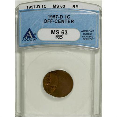 <B>1957-D 1C Cent--Off Center--MS63 Red and Brown ANACS.</B></I> <BR><BR><B>Coin Engraver:</B> Victor D. Brenner<BR><BR><b>Shipping:</b> Coins & Currency (<a target="_blank" href="http://www.heritageauctions.com/common/shipping.php">view shipping information</a>)