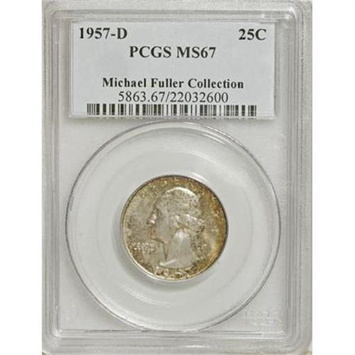 <B>1957-D 25C MS67 PCGS.</B></I> Michael Fuller Collection. PCGS Population (60/0). NGC Census: (153/2). Mintage: 77,924,160. Numismedia Wsl. Price for NGC/PCGS coin in MS67: $232. (#5863)<BR><BR><B>Coin Engraver:</B> John Flanagan<BR><BR><b>Shipping:</b> Coins & Currency (<a target="_blank" href="http://www.heritageauctions.com/common/shipping.php">view shipping information</a>)