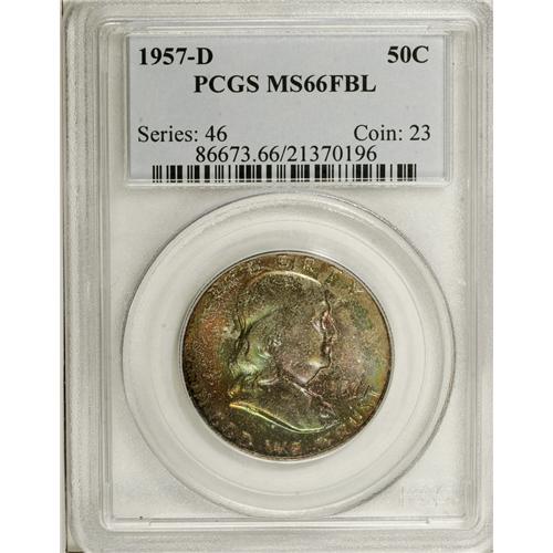 <B>1957-D 50C MS66 Full Bell Lines PCGS.</B></I> Rick Tomaska (2002) writes that: "Most 1957-D Franklins found in mint sets exhibit very drab, gray or dull brown toning, with plentiful bagmarks," and that: "MS 66 FBL 1957-D Franklins with exceptional color are rare ... ." The sharply struck Premium Gem in this lot displays a melange of vivid multicolored toning throughout the obverse and along the periphery of the reverse. Generally well preserved, though a few minute marks are visible on the bell.<BR><BR><b>Shipping:</b> Coins & Currency (<a target="_blank" href="http://www.heritageauctions.com/common/shipping.php">view shipping information</a>)