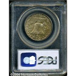 <B>1957-D<50C> MS66 Full Bell Lines PCGS.</B></I> The obverse has rich green, gold, and lavender-crimson patina, while the reverse has olive-green and antique-gold patina. Well struck with good luster and very pleasing surfaces. Population: 291 in 66, 7 finer (7/04). <BR><BR><B>Important notice:</B> Heritage usually auctions material at the rate of 200-250 lots per hour. On some occasions eBay Live bid software or the Internet may not be able to keep up with the pace of the auction. We recommend placing a realistic absentee bid now as insurance to avoid disappointment. Occasionally the auctioneer may eliminate or reject an eBay Live bid, and the auctioneer may also reopen a lot after the close of the eBay live bidding (usually because we missed an audience bid), and may reject your bid even if it shows you as the winning bidder. By bidding via eBay Live, you agree that Heritage may award the lot to another bidder at its sole discretion under the circumstances described above or any other reasonable circumstances. Since eBay bids are not shown to us until we open the lot on the floor, we treat those bids just like floor bids. In most cases the floor responds before the eBay bid is presented to us, due to Internet lag time, so for consistency we have made it a policy that floor bids are always considered first over tie eBay live bids. Also please note that all Heritage lots purchased through eBay Live carry a 20% Buyer's Premium. Please make sure you read the Terms and Conditions before you bid. </span></font></tr></table></td></tr></table>