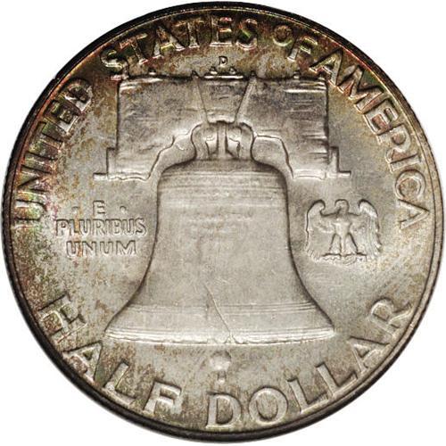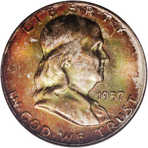 <B>1957-D<50C> MS67 Full Bell Lines NGC.</B></I> Beautiful orange, rose, and lime-green toning from decades of mint set storage. Seldom available in this outstanding grade. Census: 4 in 67 Full Bell Lines, 0 finer (4/06).