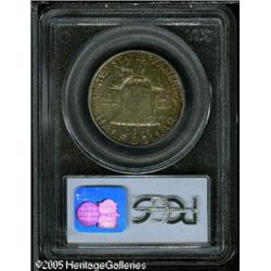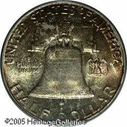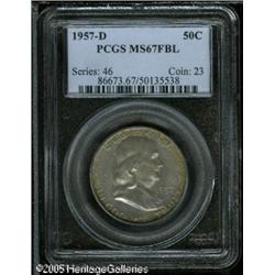 <B>1957-D 50C MS67 Full Bell Lines PCGS.</B></I> The typical example of this issue, from mint sets of the year, has rather unattractive brown toning with lots of surface marks. This '57-D is not your typical example, for the surfaces are nearly perfect and the toning attractive. The obverse has mostly grayish-lilac color with peripheral gold and iridescent toning. The reverse has speckled gold, rose, and greenish colors and is quite lovely. Just a few of these have been certified by PCGS, and there has never been a finer example graded. Population: 8 in 67, 0 finer (1/05). Lot:8309