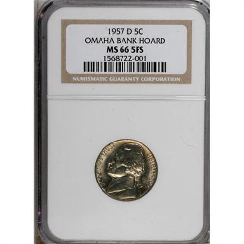 <B>1957-D 5C MS66 Five Full Steps NGC.</B></I> NGC Census: (6/0). PCGS Population (8/0). (#84062)<BR><BR><b>Shipping:</b> Coins & Currency (<a target="_blank" href="http://www.heritageauctions.com/common/shipping.php">view shipping information</a>)