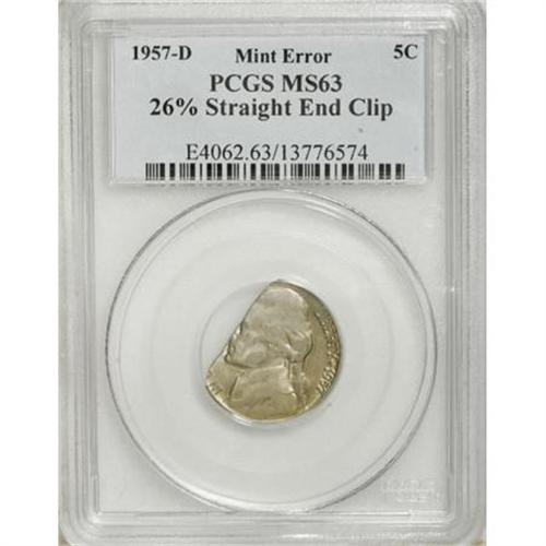 <B>1957-D 5C Jefferson Nickel--26% Straight End Clip--MS63 PCGS.</B></I> <BR><BR><B>Coin Engraver:</B> Felix Schlag<BR><BR><b>Shipping:</b> Coins & Currency (<a target="_blank" href="http://www.heritageauctions.com/common/shipping.php">view shipping information</a>)
