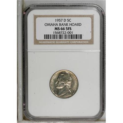 <B>1957-D 5C MS66 Five Full Steps NGC.</B></I> Ex: Omaha Bank Hoard. Medium gold toning adorns this satiny and carefully preserved Premium Gem. Sharper than generally seen, since only the center of the lowest step is incomplete. Census: 6 in 66 5FS, 0 finer (5/07).<BR><BR><b>Shipping:</b> Coins & Currency (<a target="_blank" href="http://www.heritageauctions.com/common/shipping.php">view shipping information</a>)