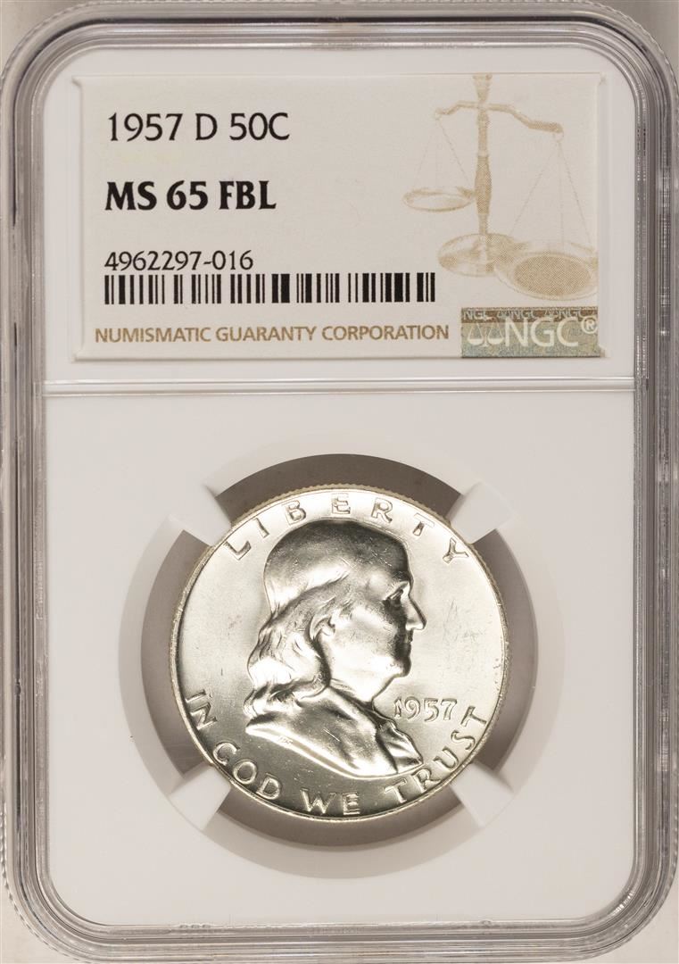 One 1957-D Franklin Half Dollar Coin NGC MS65FBL. NGC Certified.