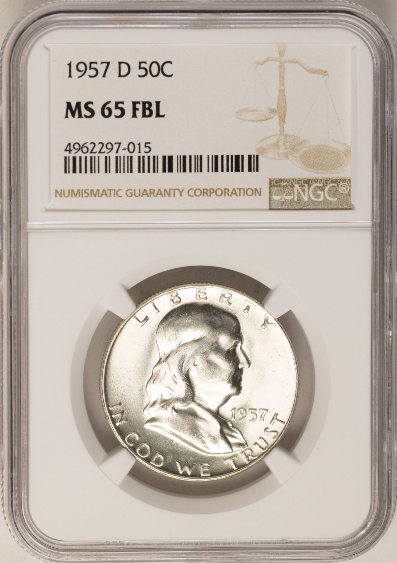 One 1957-D Franklin Half Dollar Coin NGC MS65FBL.