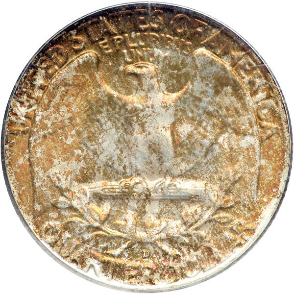 1957-D Washington Quarter Dollar. PCGS graded MS-66. Wonderful lilac and golden-sunset to crimson toning. Pulled from a mint set. Pop 549; 59 finer in 67 (PCGS # 5863) .