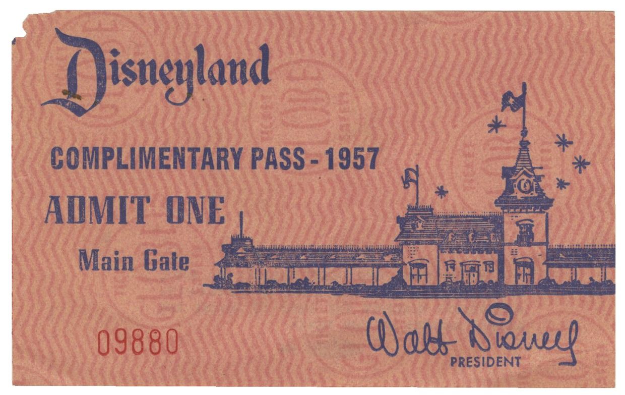 (Disneyland, 1957) A very rare complimentary admission pass to Disneyland for the year 1957. The pass features an illustration of Main Street Station on the front with a facsimile signature by Walt Disney. The ticket is numbered "09880" and information on the ticket's use is listed on the back side. The pass measures 2.5"x4" and is in good condition with some edge and corner wear.