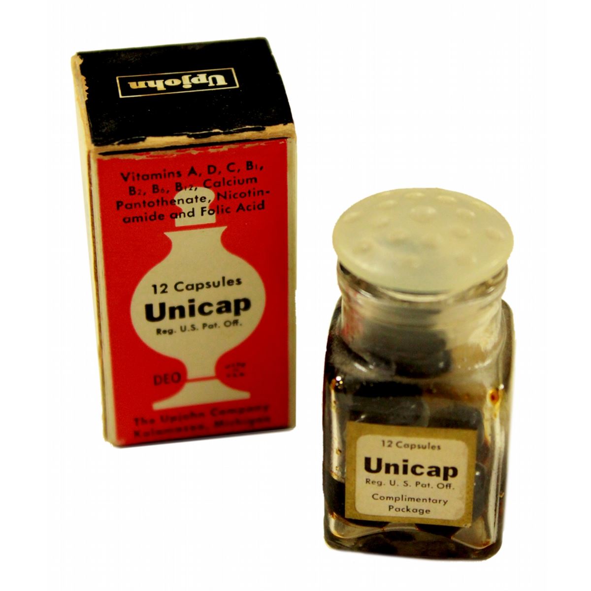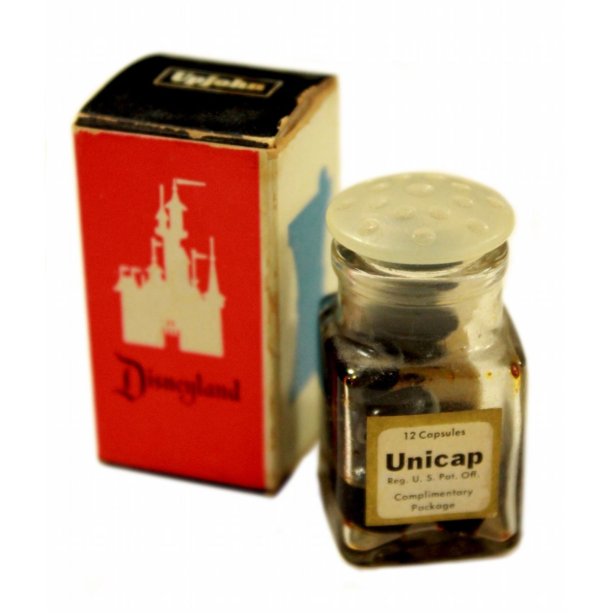 Back in the 1950s, many of the sponsors on Main Street used the venue as a true public relations point. The Upjohn Pharmacy Drugstore generously gave away these Unicap Bottled Vitamin packs to visitors to its realistic recreation of a turn-of-the-century apothecary. Original vitamins intact and unused in original box. Very rare. Measures 1.75" high by 1"x1".