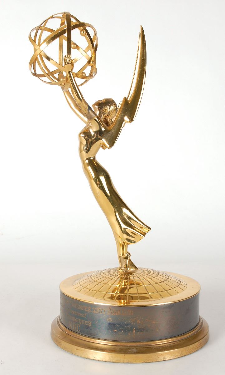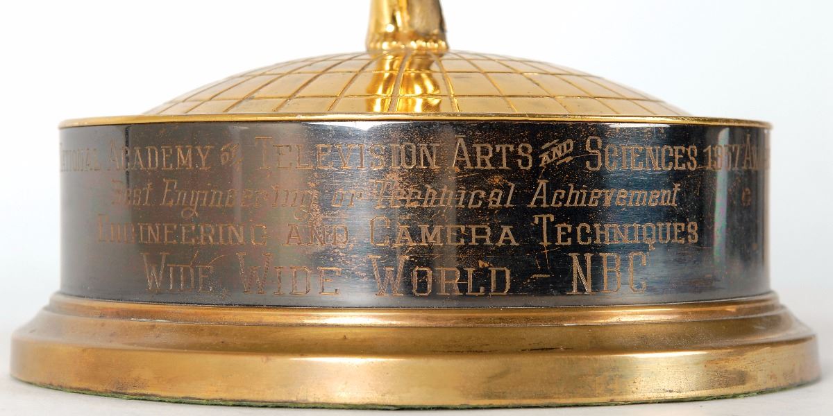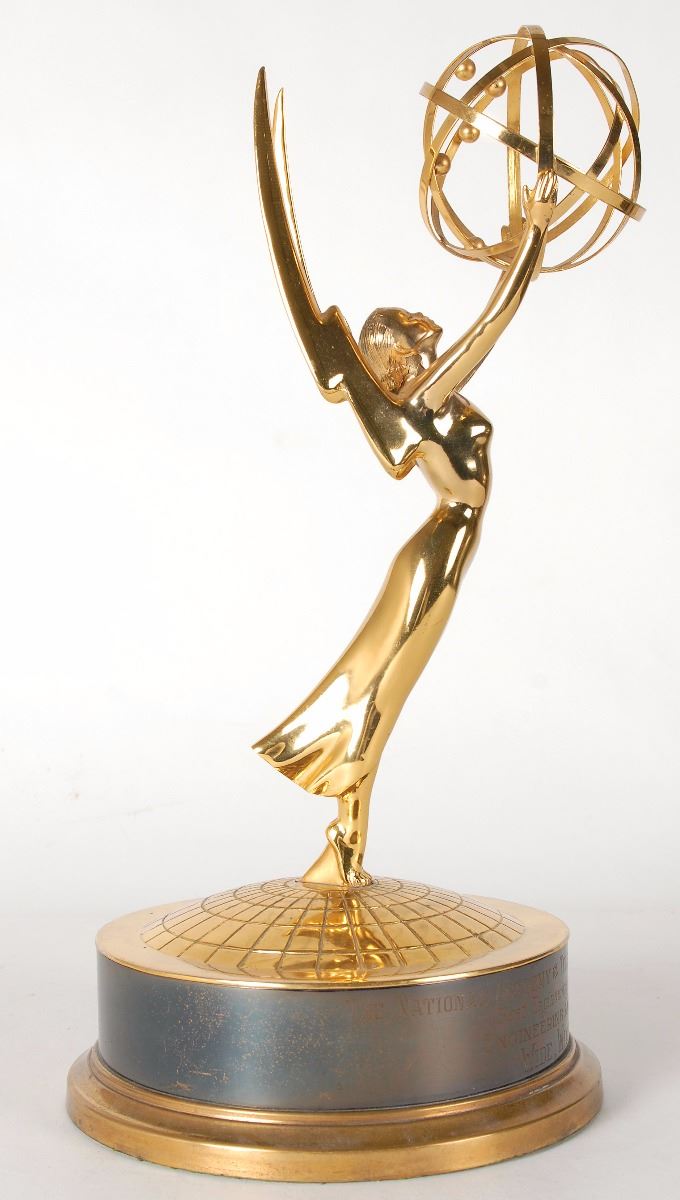 Iconic original Emmy statuette awarded to the NBC show Wide Wide World in 1957. The award trophy measures approximately 15? tall with a base diameter of 7.5?, and is handsomely engraved on the base, “The National Academy of Television Arts and Sciences 1957 Awards, Best Engineering or Technical Achievement, Engineering and Camera Techniques, Wide Wide World—NBC.” Some flaking to the finish on the statuette’s arm and tarnishing to engraved plaque, otherwise fine condition. Wide Wide World was a popular documentary television series that ran on Sunday afternoons from 1955 through 1958 and brought viewers to diverse locales, primarily throughout America. In one of its most famous episodes on December 23, 1956, the show traveled to a reservoir in Arkansas and—after stringing miles of cable through the wilderness and setting up remote cameras and microphones—managed to capture images of an unimaginably large flock of 300,000 ducks in flight during their live broadcast. It was this type of impressive filmmaking that earned this Emmy, with which the National Academy of Television Arts and Sciences specifically recognized the ‘engineering and camera techniques on Wide Wide World used in the mountains, in the air and in and on the sea.’ The successful deployment of multiple cameras—which often weighed over two hundred pounds each—to show these remote places around the world to a live television audience was a phenomenal feat. Truly spectacular, this is a rarely offered example of an important national Emmy presented at the 9th Primetime Emmy Awards acknowledging groundbreaking and pioneering efforts in television.
