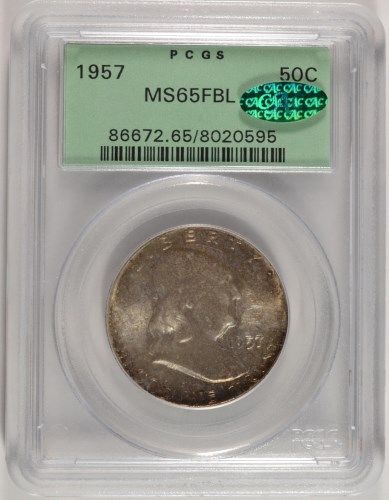 1957 FRANKLIN HALF DOLLAR, PCGS GREEN LABEL MS-65 FBL CAC STICKER! RARE!