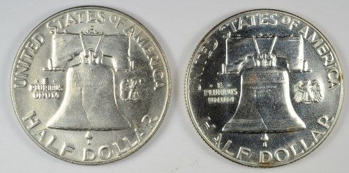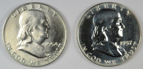 1957 FRANKLIN HALF DOLLAR, PROOF 65 AND 1954-D FRANKLIN HALF DOLLAR, MS-64