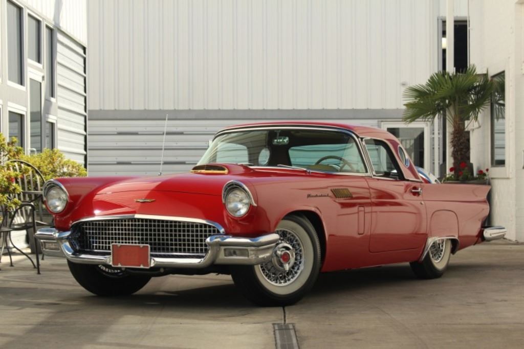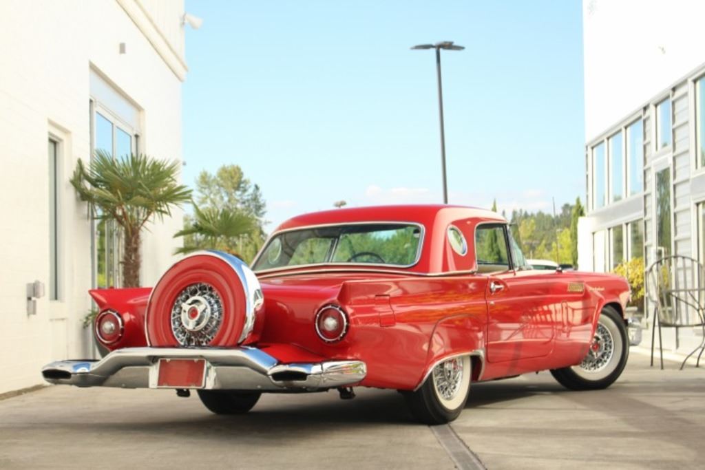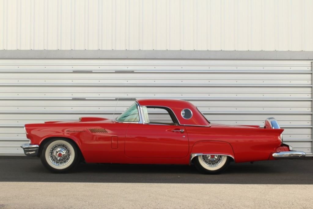 1957 Ford Thunderbird finished in Red with Gold Accents and Tan Interior. 945 Miles since restoration. This beautiful example is powered by a 312ci 4bbl V8 and driven by an Automatic Transmission. The chrome air cleaner sets apart this engine from many others. Other features include; A/C, Rare "Bird's Nest" Rumble Seat Conversion, Front Disc Brake Conversion, Power Steering, Dual Exhaust, Fiberglass Porthole Hard Top, Kelsey-Hayes Wires with Wide Whites, Extended Rear Bumper with Continental Kit, Fender Skirts, Chrome "Eyebrow" Headlamp Trim, Soft Leather Upholstery, Leather Door Trim, Courtesy Lamps, Instrumentation (Clock, Gold Exterior and Engine Bay Trim), and original owners and shop manuals are included... The Ford Thunderbird was the answer to GM and the 1953 Chevrolet Corvette. In 1955, Ford decided it was their turn and gave full reigns to their team to design a two-seater that was for the everyday person. Though the first installment wasn't as fast as those from Chevy, they eventually solidified the Thunderbird as a classy two-seater with some power. 1957 would end up being the last version of the Thunderbird that was known for its sporty demeanor and allowing only two people in the cabin, as they would later redesign the car moving forward. Other standout features included a power seat, a radio that was controlled by speed, a new dash and console area, and fins that made the car show off a bit more than its predecessors. The Thunderbirds are still highly collectible and sought after in today's market. This is one that shouldn't be missed.