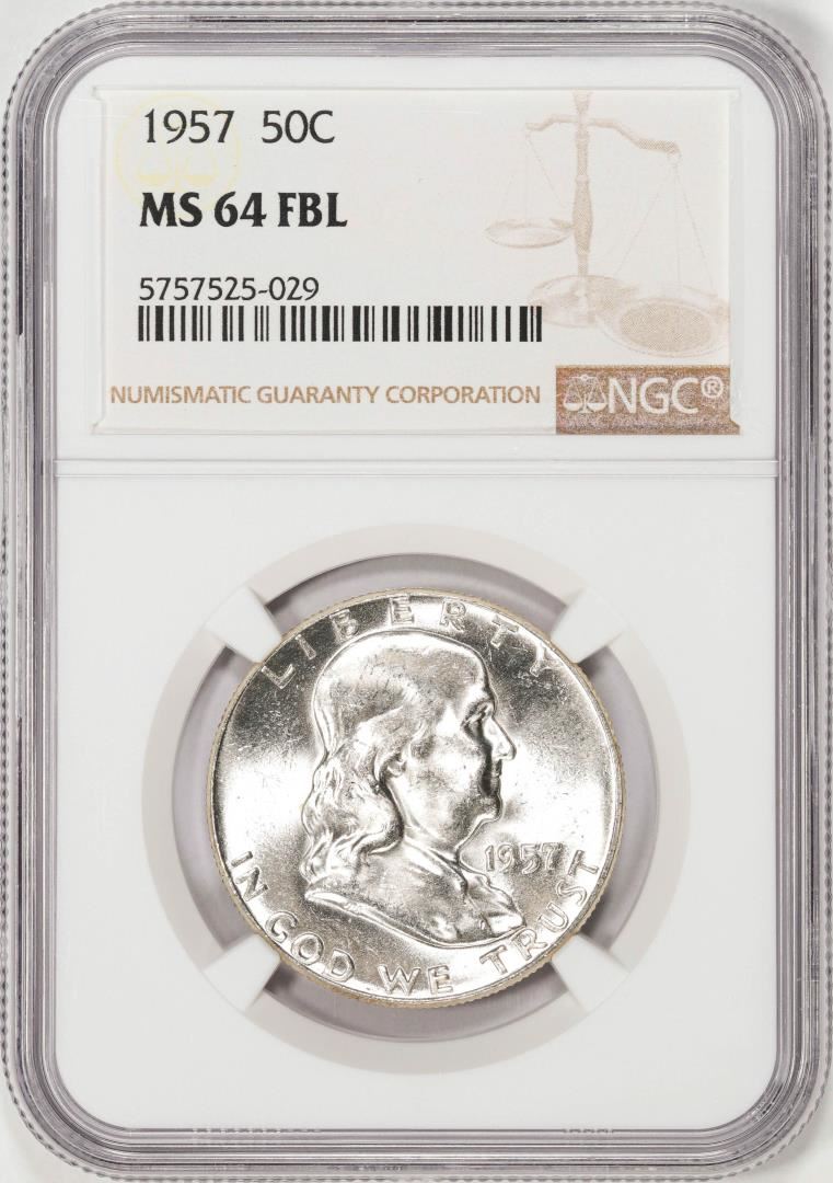 One 1957 Franklin Half Dollar Coin NGC MS64 FBL. NGC Certified.