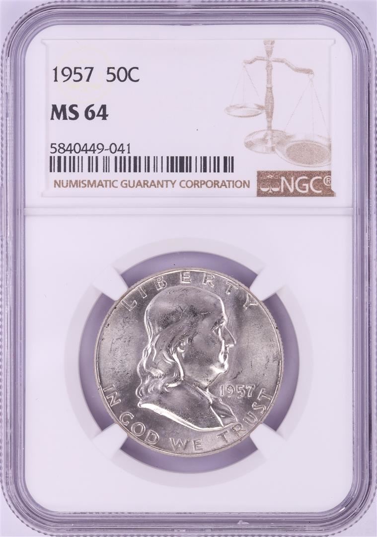 One 1957 Franklin Half Dollar Coin NGC MS64. NGC Certified.