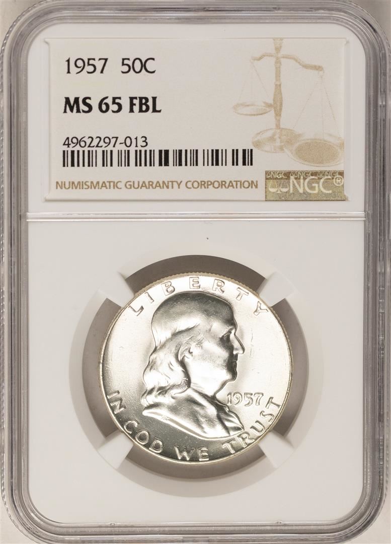 One 1957 Franklin Half Dollar Coin NGC MS65FBL. NGC Certified.