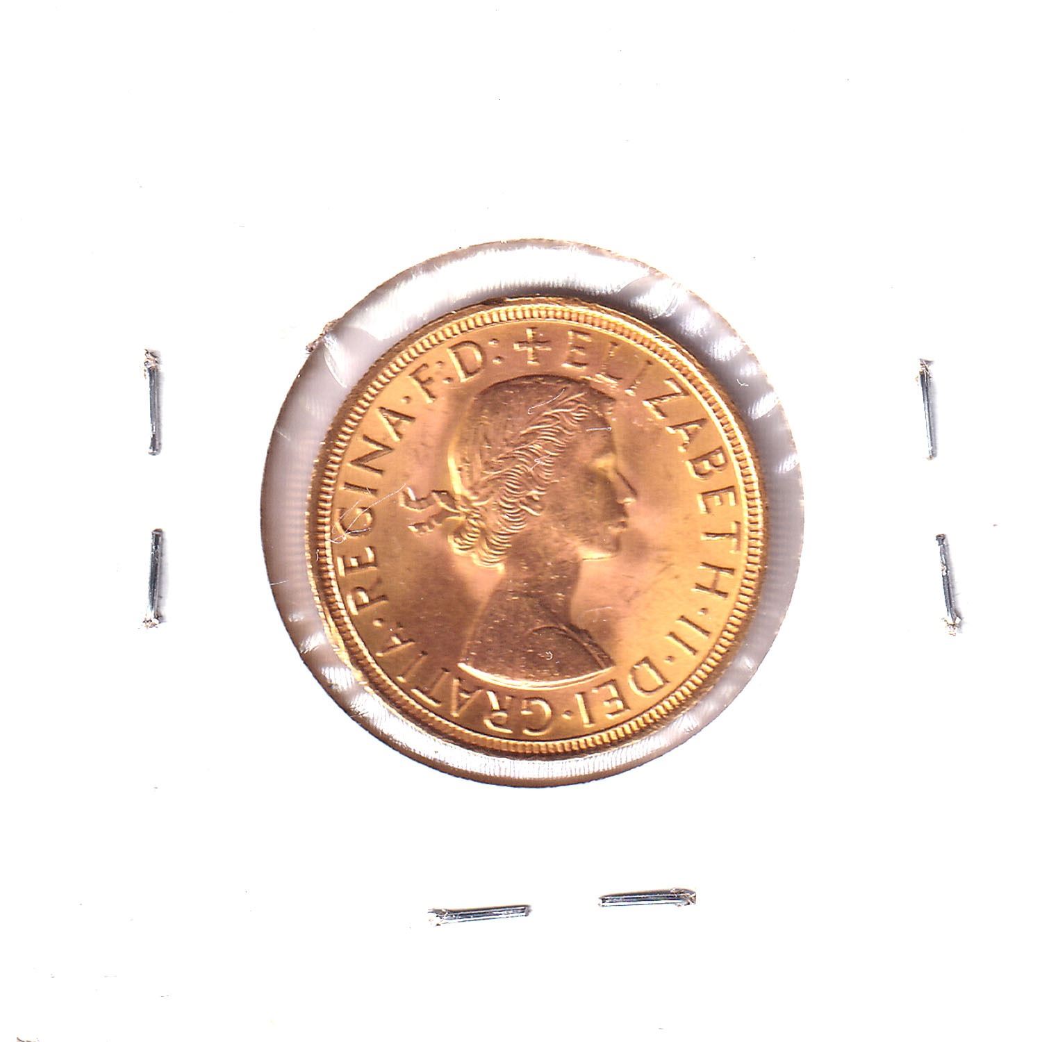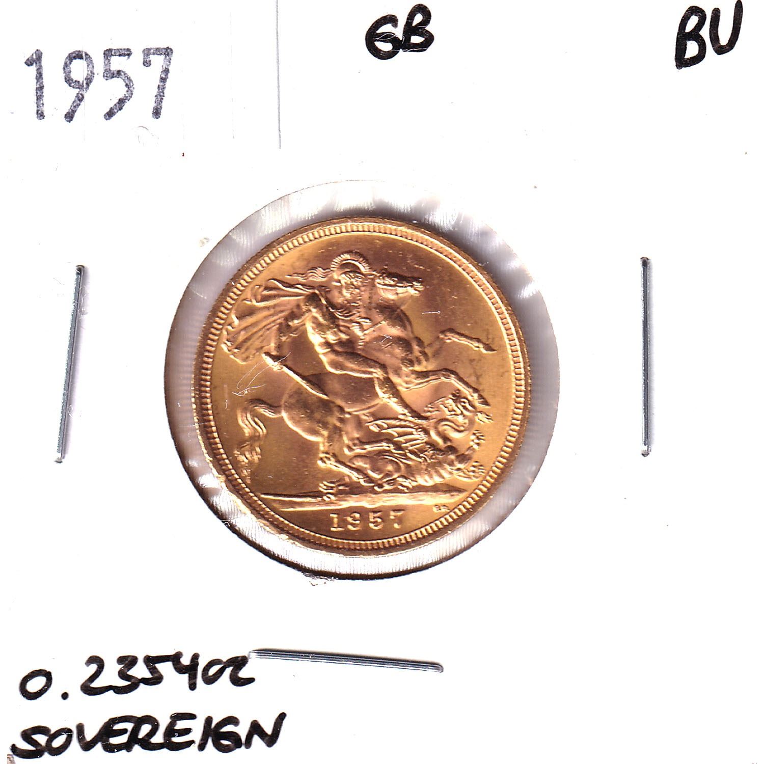 1957 Great Britain Sovereign Brilliant Uncirculated. Contains 0.2354oz Fine Gold.