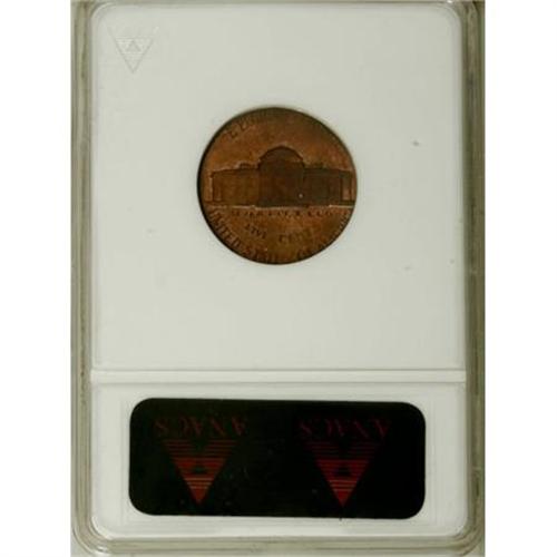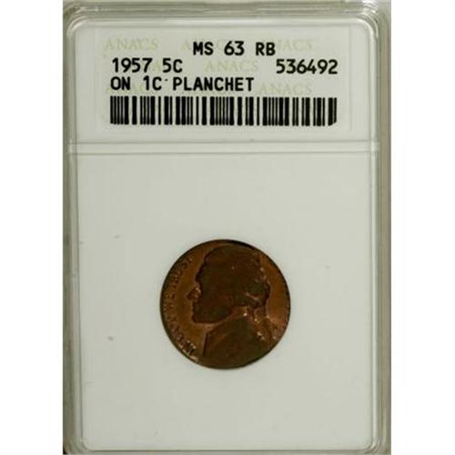 <B>1957 Jefferson Nickel--On a Cent Planchet--MS63 Red and Brown ANACS.</B></I> Slightly uncentered toward 3 o'clock, with about 50% of the date visible. The devices are toned steel-blue and violet, and the fields are pumpkin-orange. Lustrous and mark-free.<BR><BR><B>Coin Engraver:</B> Felix Schlag<BR><BR><b>Shipping:</b> Coins & Currency (<a target="_blank" href="http://www.heritageauctions.com/common/shipping.php">view shipping information</a>)