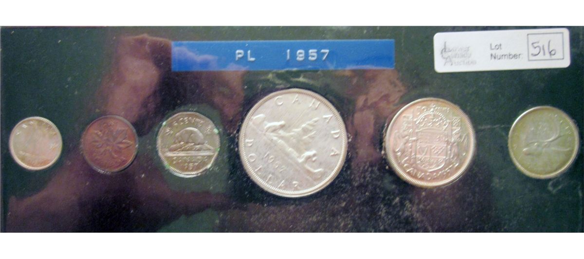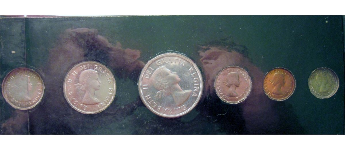 1957 Proof Like in white cardboard, cent Red, 5 cents as corrosion.