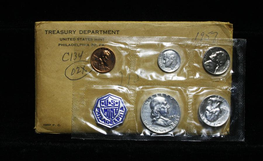 Much rarer side opening packaging. Only the very early produced sets in 1957 had the side opening packaging. The set, has a 90% Proof Silver Franklin Half Dollar, a 90% Proof Silver Quarter, a 90% Silver Dime, 2 Other Proof Coins. Estimated Value $60