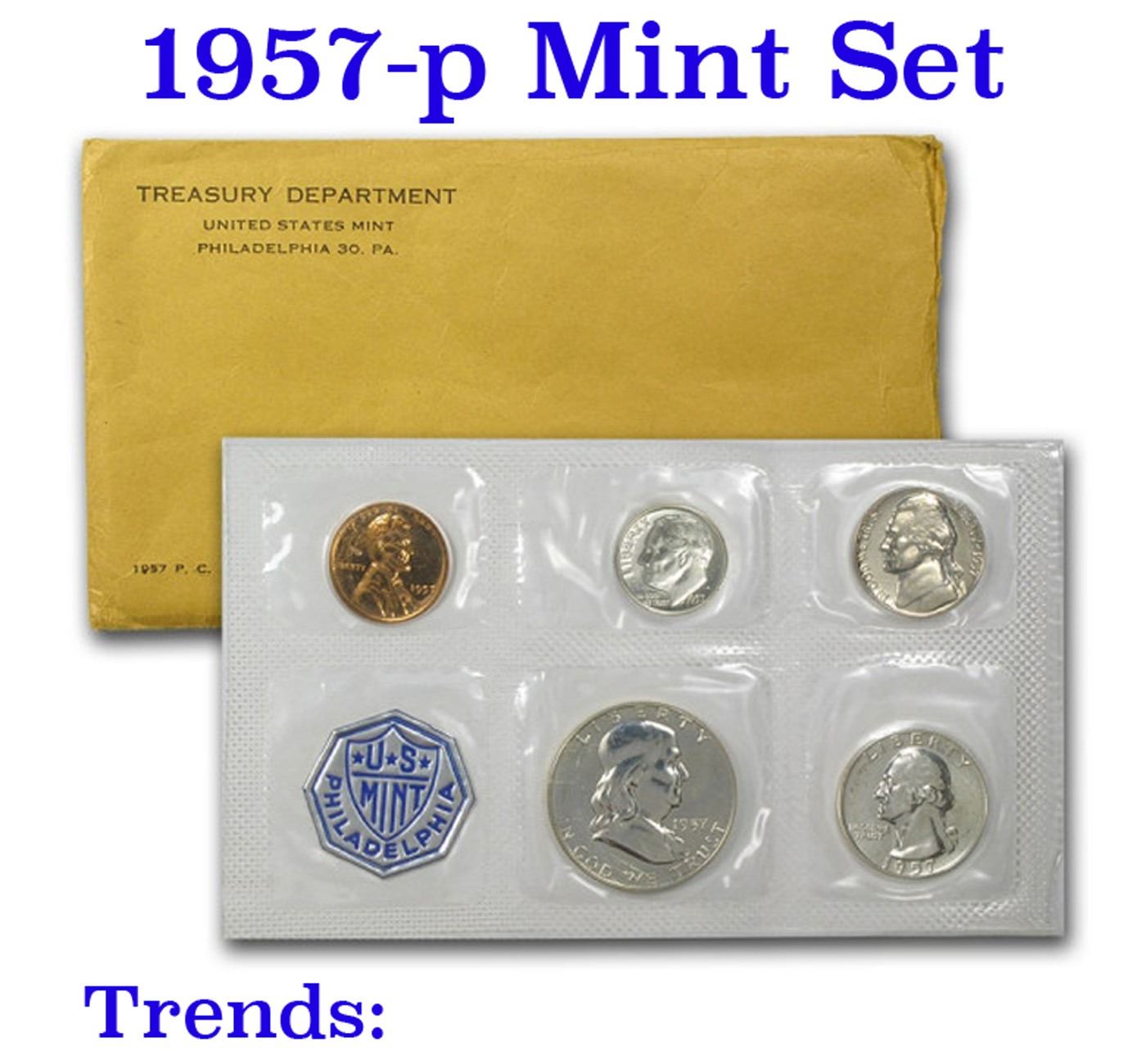 1957 Proof Set in Original Packaging with the mint memo. This set contains a 90% Proof Silver Franklin Half Dollar, a 90% Proof Silver Quarter, a 90% Proof Silver Dime plus the proof nickel and proof penny. This set is in the original mint packaging with the envelope and the mint memo. All 5 coins grade Gem+ Proof or better. This proof set is over 50 years old!