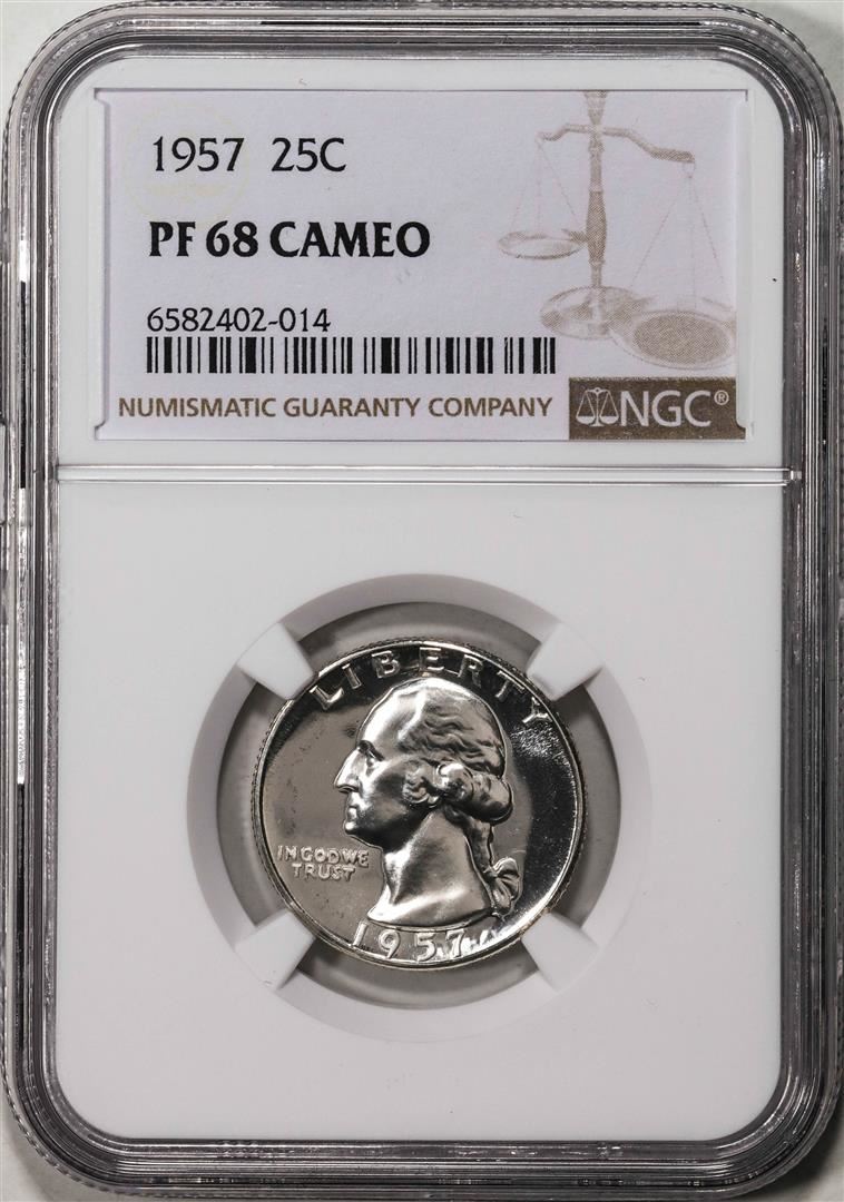 One 1957 Proof Washington Quarter Coin NGC PF68 Cameo. NGC Certified.