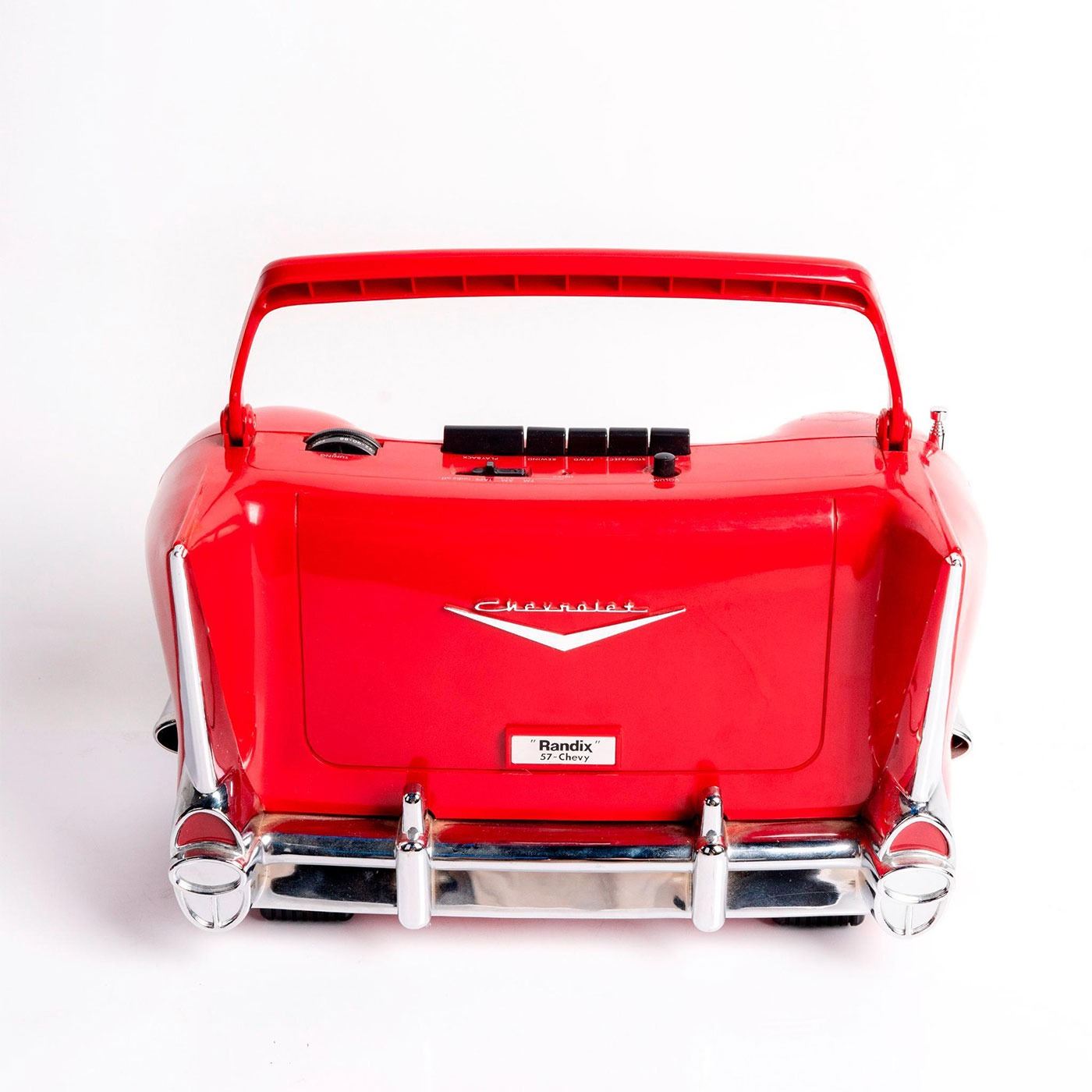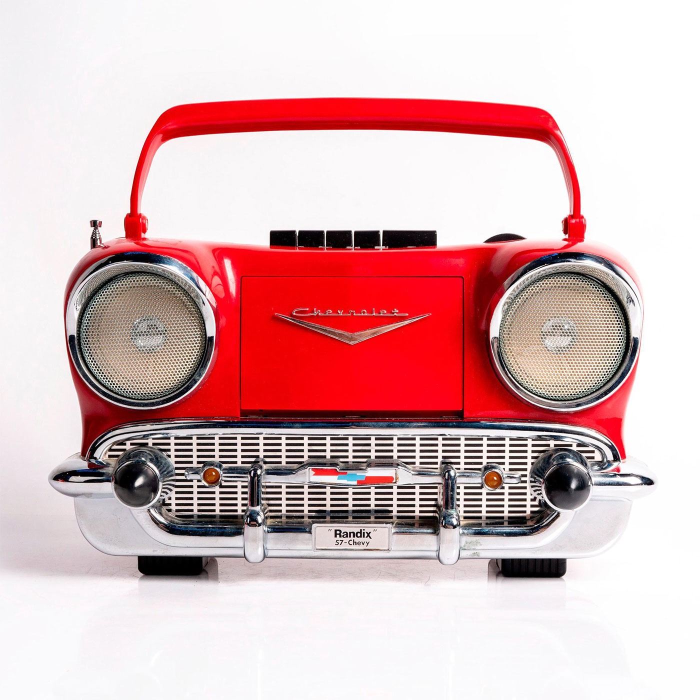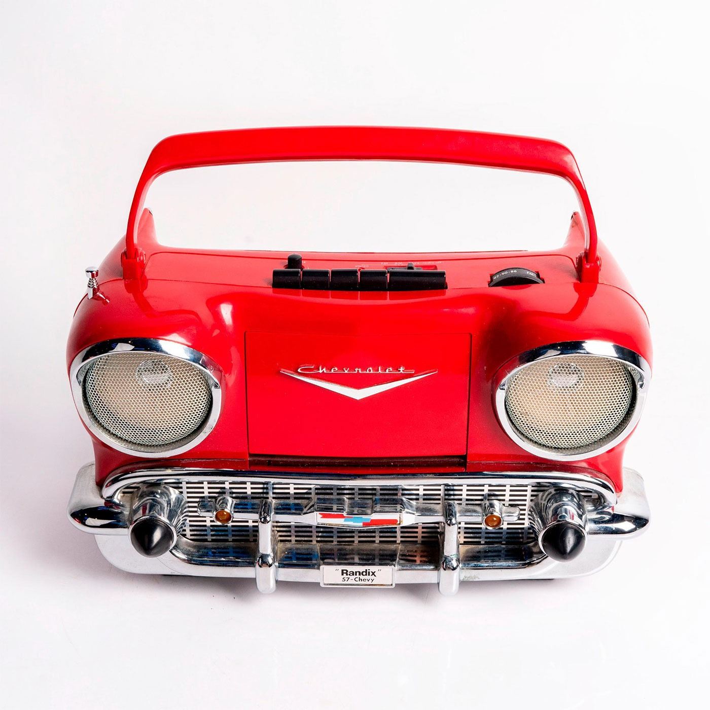 A battery operated Radio/Cassette player of a 1957 Chevy vehicle. This Randix Vintage radio is a hand held reproduction radio showing the front and rear of a 1957 red Chevy. In good condition and in working order at the time of this listing. Lion and Unicorn auctions does not guarantee the working order of mechanical items although this example is receiving reception and does play currently. Requires 8 C cell batteries. Complete with carry handle and retractable antenna. Plastic body. This radio was marketed by Radnix Corp of America. Automobilia and Americana, Advertisement and Signs