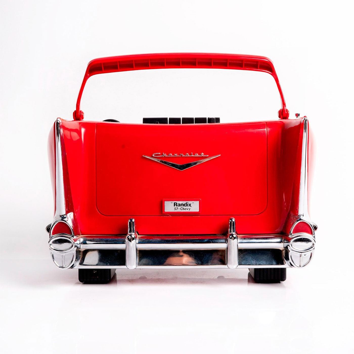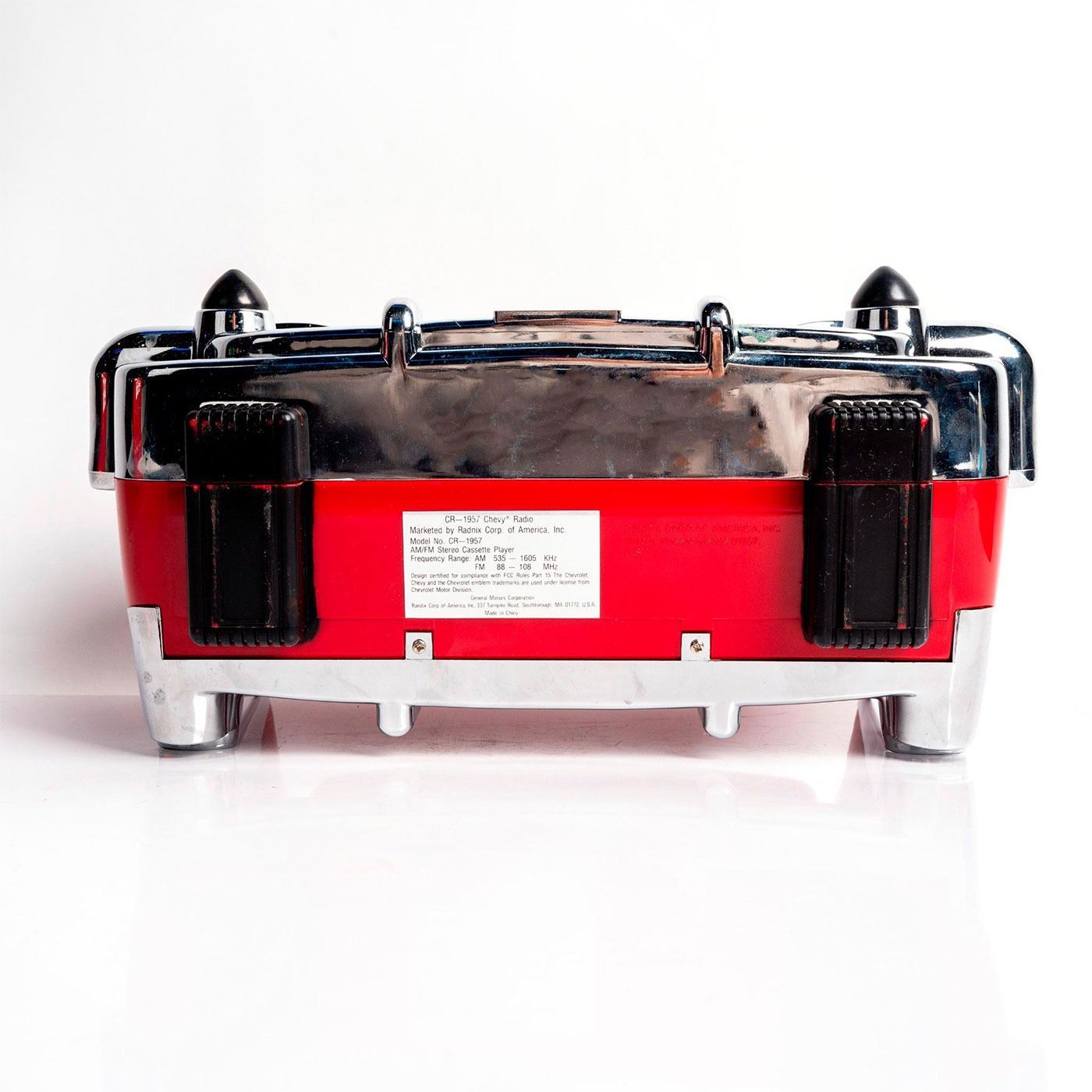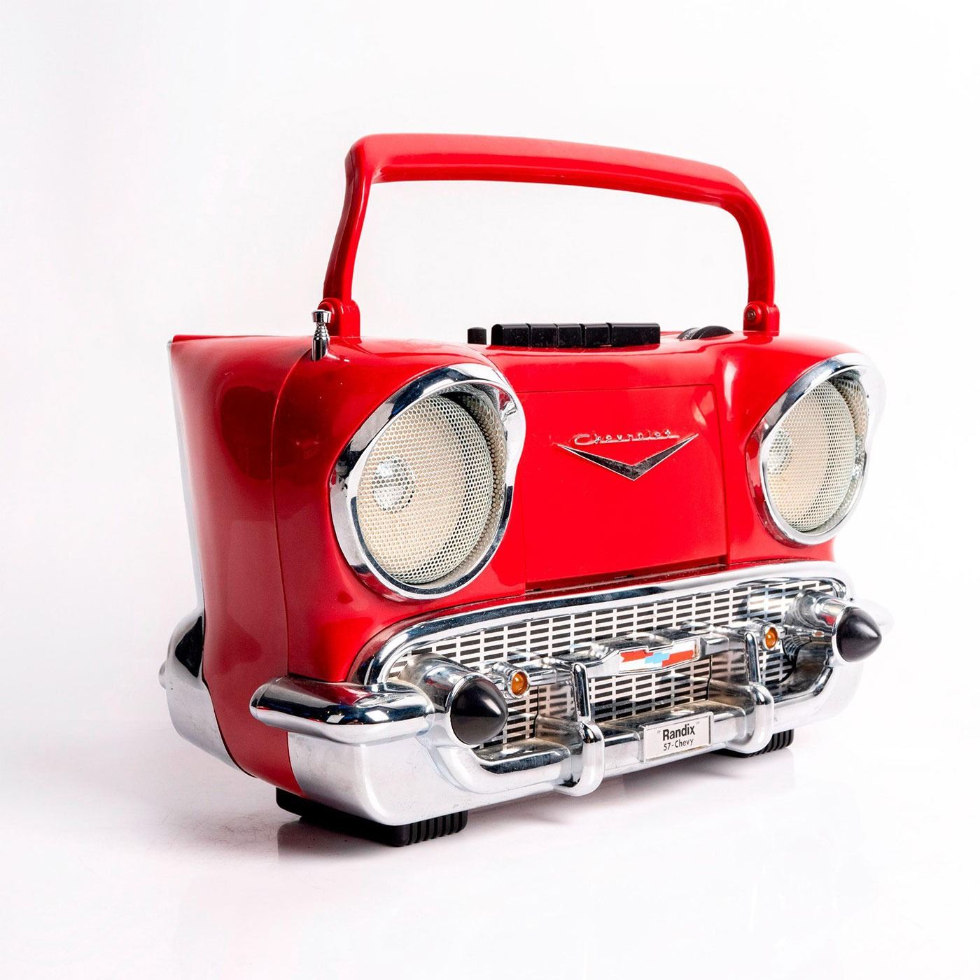 A battery operated Radio/Cassette player of a 1957 Chevy vehicle. This Randix Vintage radio is a hand held reproduction radio showing the front and rear of a 1957 red Chevy. In good condition and in working order at the time of this listing. Lion and Unicorn auctions does not guarantee the working order of mechanical items although this example is receiving reception and does play currently. Requires 8 C cell batteries. Complete with carry handle and retractable antenna. Plastic body. This radio was marketed by Radnix Corp of America. Automobilia and Americana, Advertisement and Signs