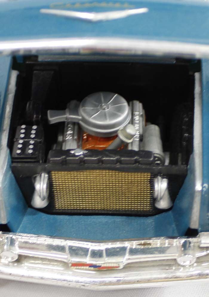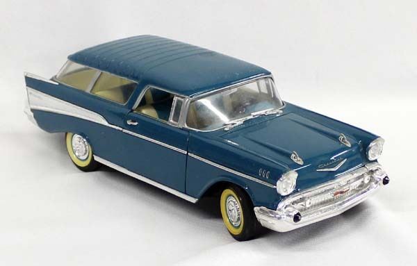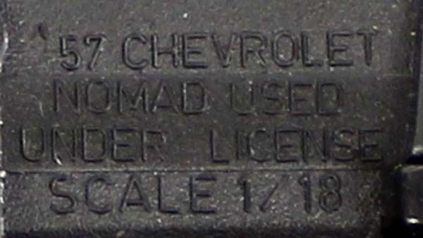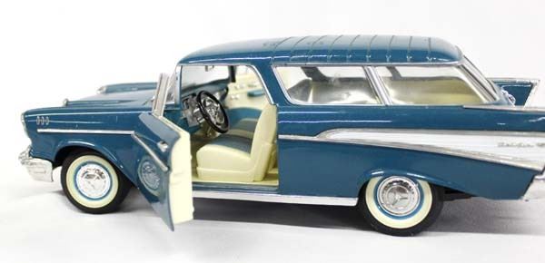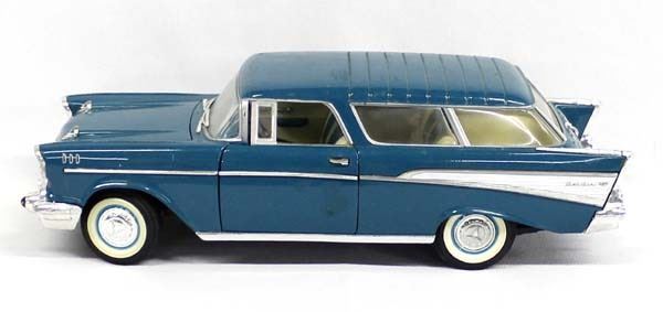 1957 Road Tough Chevy Nomad Die Cast Model, measures 10.5''L, 1/18 scale, doors and hood open up, some scratching on the roof