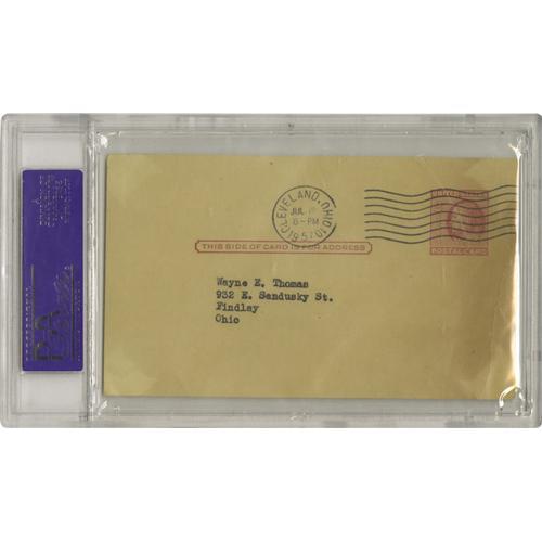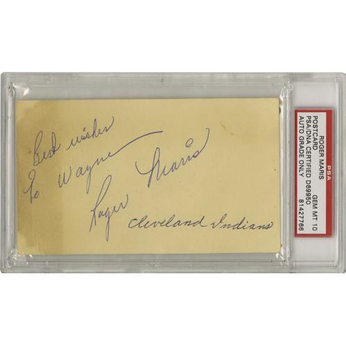 <B>1957 Roger Maris Signed Government Postcard.</B></I> One of the most appealing Maris autographs we've ever encountered. Penned just three months after the future King's Big League debut, this GPC postmarked "Cleveland, Ohio, July 12, 1957" is inscribed in Maris' 10/10 blue ink hand, "Best wishes to Wayne, Roger Maris, Cleveland Indians." A bit of toning at left edge in noted only for the sake of accuracy. A fantastic companion piece to the rookie Mantle government postcard also found within this auction. Encapsulated by PSA/DNA for protection and unquestioned authenticity.<BR><BR><b>Shipping:</b> Sportscard (<a target="_blank" href="http://www.heritageauctions.com/common/shipping.php">view shipping information</a>)