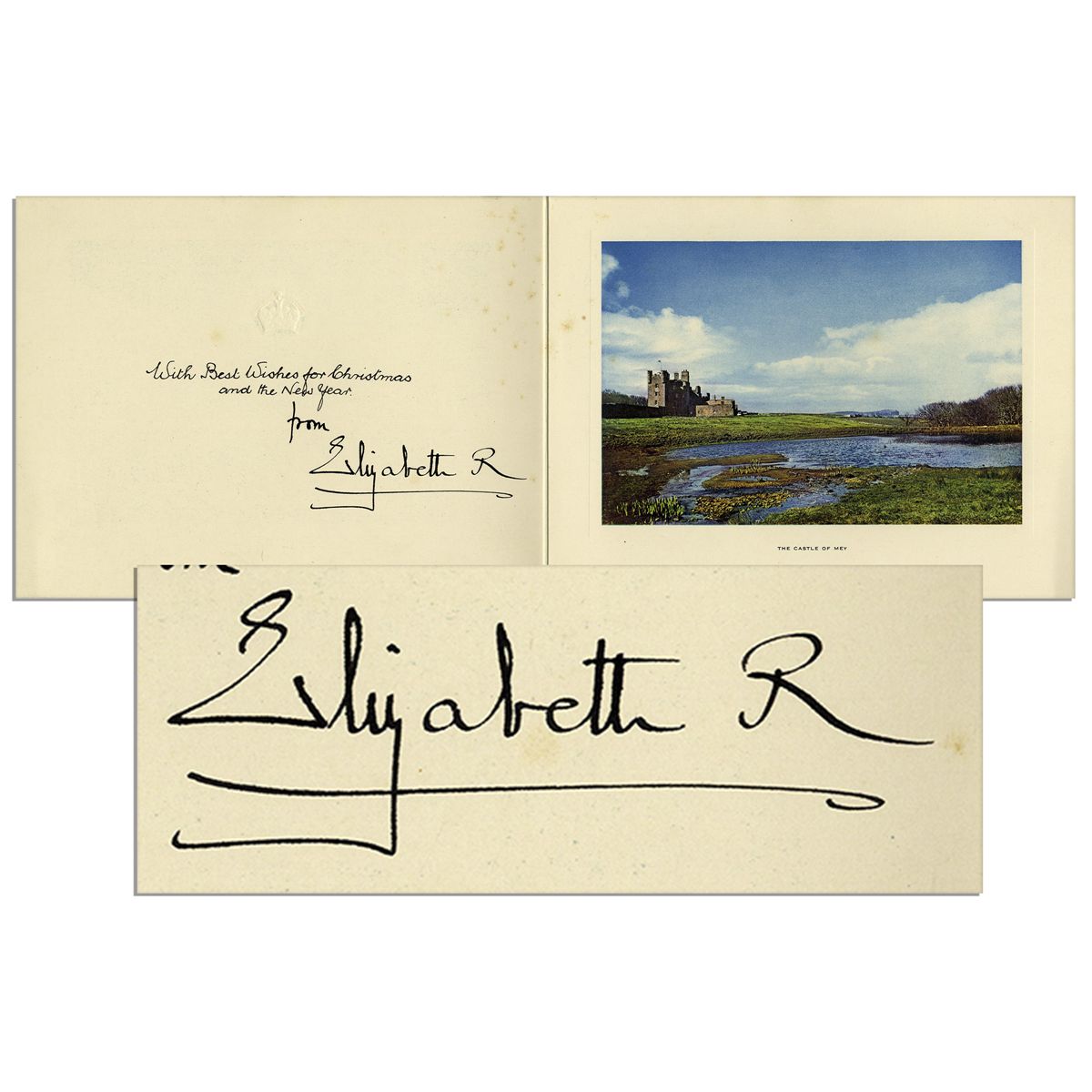 Christmas card from Queen Elizabeth the Queen Mother, signed ''Elizabeth R''. Card opens to a sentiment reading, ''With Best Wishes for Christmas / and the New Year''. Opposite is a color photo of the Caste of Mey and its neighboring bog in the foreground. The front of the card features a gilt crown. Accompanied by original mailing envelope postmarked 19 December 1957. Measures 8.25'' x 6.25''. Light toning and foxing, else near fine.