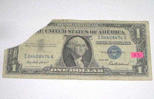 1957 SERIES $1 SILVER CERTIFICATE BILL SERIAL #I04408474A *NICE EARLY U.S. DOLLAR*!! BILL HAS A CORNER TORN OFF & CAME OUT OF SAFE!! ***Coin, Currency & All Items Listed in this auction - Grades, Conditions and Values are not Safe Deposit Coins LLC Responsibilty. Grades, Condition and Values are determined by Consigner(s) & Buyers ONLY***