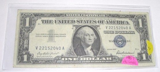 1957 SERIES $1 SILVER CERTIFICATE SERIAL # V22152040A *RARE AU HIGH GRADE*!! ***Coin, Currency & All Items Listed in this auction - Grades, Conditions and Values are not Safe Deposit Coins LLC Responsibilty. Grades, Condition and Values are determined by Consigner(s) & Buyers ONLY