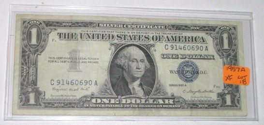 1957 SERIES A $1 SILVER CERTIFICATE BILL SERIAL # C91460690A *RARE EARLY EXTRA FINE GRADE*!! DOLLAR BILL CAME OUT OF SAFE!! ***Coin, Currency & All Items Listed in this auction - Grades, Conditions and Values are not Safe Deposit Coins LLC Responsibilty. Grades, Condition and Values are determined by Consigner(s) & Buyers ONLY***