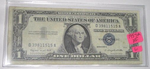 1957 SERIES A $1 SILVER CERTIFICATE BILL SERIAL #D39811515A *RARE EXTRA FINE GRADE*!! BILL CAME OUT OF SAFE!! ***Coin, Currency & All Items Listed in this auction - Grades, Conditions and Values are not Safe Deposit Coins LLC Responsibilty. Grades, Condition and Values are determined by Consigner(s) & Buyers ONLY
